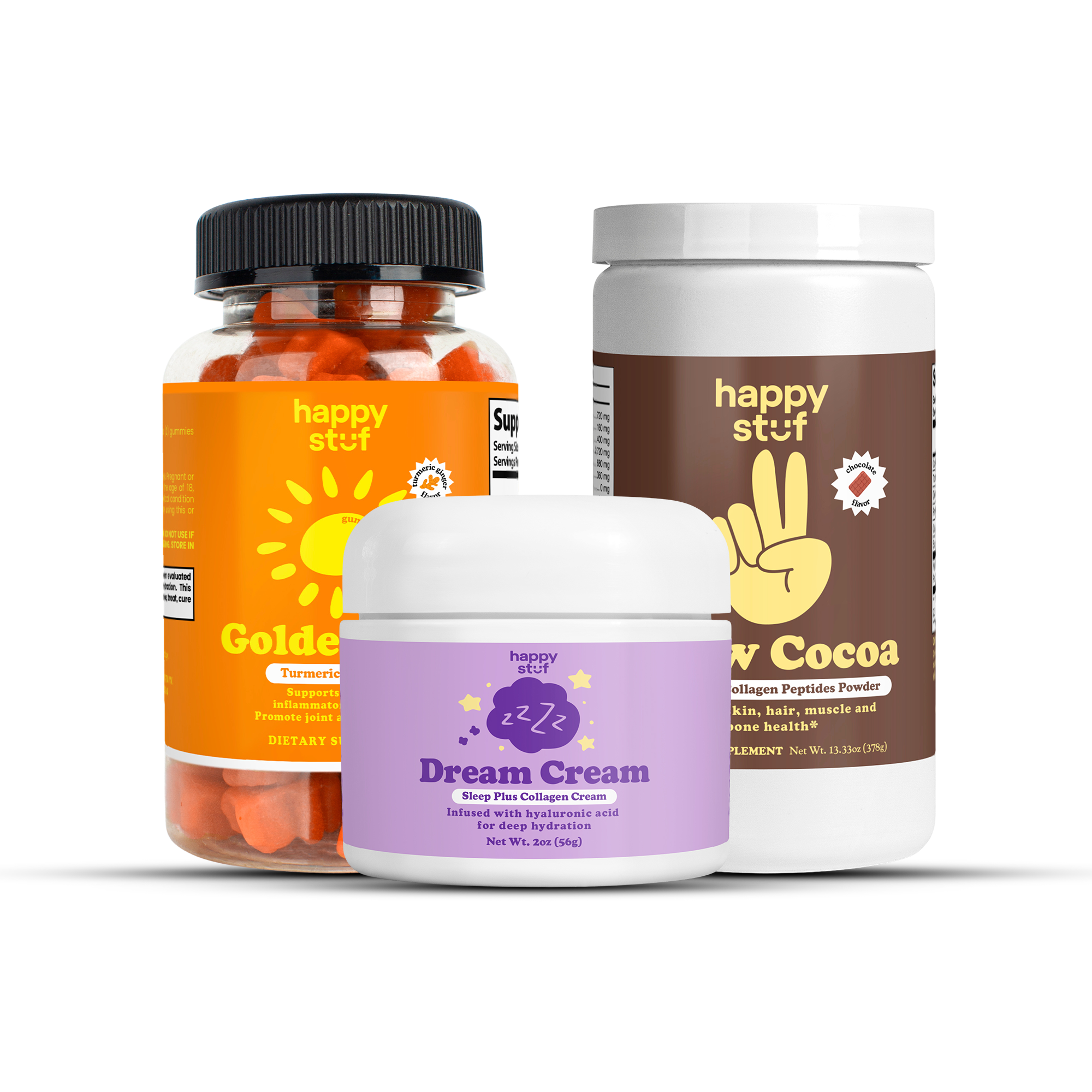 The Glow Flow Bundle supports skin, hair, nails, joint health, and restful sleep—morning collagen, turmeric support, and nighttime renewal in one radiant ritual.